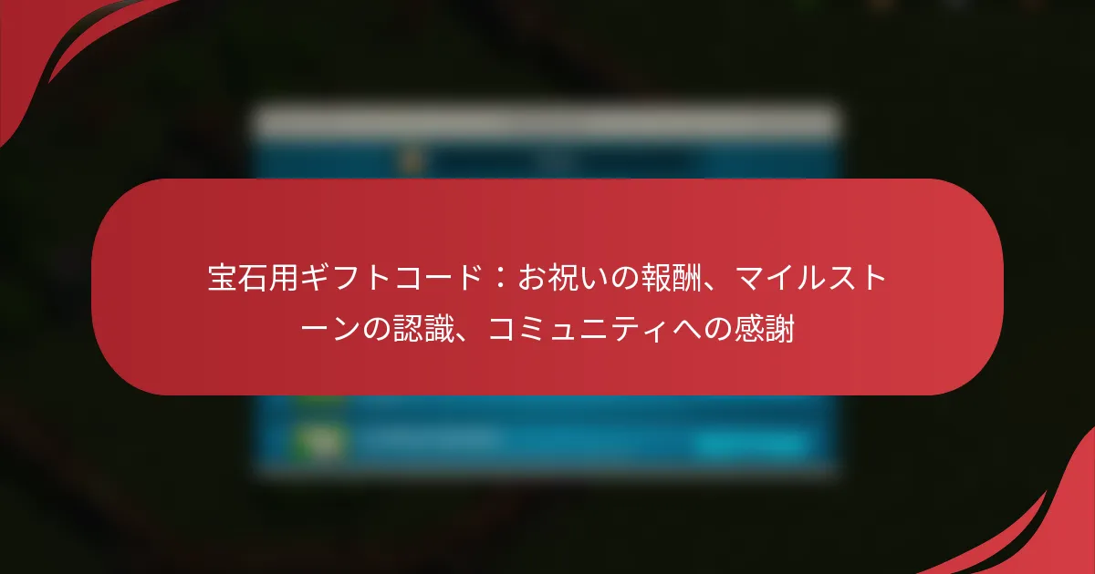 宝石のギフトコードは、プレイヤーがゲーム内通貨と引き換えられる貴重なプロモーションツールであり、ゲーム体験を大幅に向上させます。これらのコードは、公式ゲームフォーラム、ソーシャルメディアプロモーション、特別なゲーム内イベントを通じて配布されることが多く、コミュニティの参加やマイルストーンの達成に対する報酬として機能します。これらのコードを引き換えることで、プレイヤーは新たな機会を得て、より充実したゲームプレイを楽しむことができます。 宝石のギフトコードとは何か、その重要性は? 宝石のギフトコードは、プレイヤーがゲーム内通貨と引き換えられるプロモーションコードであり、ゲーム体験を向上させます。これらのコードは、プレイヤーの参加を促し、ゲーム環境内でのコミュニティ構築のインセンティブとして機能します。 宝石のギフトコードの定義 宝石のギフトコードは、ゲーム開発者やパブリッシャーが提供する英数字の文字列で、プレイヤーは自分のアカウントに入力することで、バーチャル通貨の一形態である宝石を受け取ることができます。これらのコードは、ソーシャルメディア、ニュースレター、特別イベントなど、さまざまなチャネルを通じて配布されることがあります。プレイヤーは通常、ゲーム内の指定されたセクションや開発者のウェブサイトを通じてこれらのコードを引き換えます。 これらのコードには有効期限が設定されていることが多く、プレイヤーに迅速な行動を促します。価値は様々で、少量の宝石から、ゲームプレイを大幅に向上させる大きな量まで提供されることがあります。 ゲームコミュニティにおけるギフトコードの重要性 ギフトコードは、ゲームコミュニティ内での参加を促進する重要な役割を果たします。これらは、プレイヤーがイベントに参加したり、コンテンツを共有したり、ソーシャルメディアプラットフォームでゲームと対話するインセンティブを提供します。この相互作用は、プレイヤー間のコミュニティ意識と忠誠心を築くのに役立ちます。 さらに、これらのコードは開発者にとってマーケティングツールとして機能し、新機能や今後のリリースを促進します。プレイヤーに宝石を報酬として与えることで、開発者は彼らにゲームをさらに探求させ、保持率を高めることができます。 祝賀報酬におけるギフトコードの役割 祝賀報酬には、ゲームの周年や季節イベントなどの特別な機会を記念するために、ギフトコードが含まれることがよくあります。これらのコードは、プレイヤーが具体的な利益を伴ってマイルストーンを祝うことを可能にし、ゲーム体験を向上させます。たとえば、ゲームの周年の際に、開発者がプレイヤーに多くの宝石を付与するコードを発表し、ログインしてお祝いに参加することを促すことがあります。 このような報酬は、プレイヤーの士気を高めるだけでなく、ゲームに対する興奮を生み出し、これらのイベント中のプレイヤーの活動を増加させます。プレイヤーは感謝され、価値を感じることができ、これがポジティブな口コミやコミュニティの成長につながることがあります。 マイルストーン認識におけるギフトコードの影響 ギフトコードは、特定のレベルに到達したり、特定のチャレンジを完了したりするなど、プレイヤーのマイルストーンを認識するために使用されることがよくあります。プレイヤーの成果に対して宝石で報酬を与えることで、開発者は彼らの献身と努力を認めます。この認識は、プレイヤーがゲームに引き続き関与し、さらなる成果を目指す動機付けとなることがあります。 たとえば、あるゲームがレベル50に到達したプレイヤーにコードを発行し、ゲームプレイ体験を向上させるブーストを提供することがあります。これは個々のプレイヤーに報酬を与えるだけでなく、他のプレイヤーも同様のマイルストーンに到達することを促し、競争的でありながら支援的な環境を育むことになります。 ギフトコードを通じたコミュニティの感謝 ギフトコードは、開発者がプレイヤーベースに感謝の意を示すためのツールとして機能します。コミュニティイベント中やプレイヤーのフィードバックに応じてコードを配布することで、開発者はプレイヤーとの関係を強化できます。この感謝は、忠誠心の向上やより活気のあるゲームコミュニティにつながることがあります。 さらに、開発者はファンアートを作成したり、フォーラムに参加したりするなどの貢献に対してプレイヤーを報酬するためにギフトコードを使用することがあります。この認識はプレイヤーの満足度を高めるだけでなく、コミュニティ内での継続的な参加や創造性を促進します。 宝石のギフトコードはどのように入手できますか? 宝石のギフトコードは、公式ゲームフォーラム、ソーシャルメディアプロモーション、ゲーム内イベントなど、さまざまなチャネルを通じて入手できます。これらの