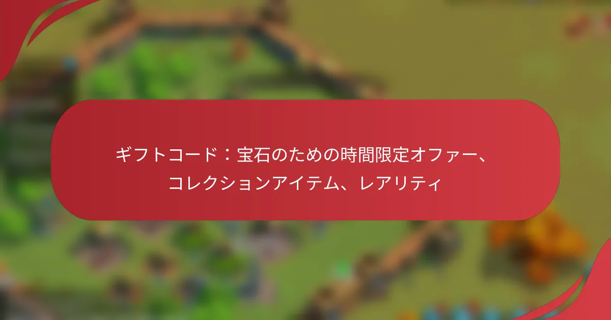 宝石用のギフトコードは、プレイヤーがゲーム内通貨、特に宝石を引き換えることを可能にするプロモーションツールであり、全体的なゲーム体験を向上させます。これらのコードはしばしば時間制限があり、コレクションアイテムや希少資源をアンロックすることができるため、プレイヤーはこれらの期間限定オファーを利用するために迅速に行動することが重要です。 宝石用のギフトコードとは? 宝石用のギフトコードは、プレイヤーがゲーム内通貨、特に宝石を引き換えるためのプロモーションコードであり、ゲーム体験を向上させます。これらのコードはしばしば時間制限があり、さまざまなゲーム内でコレクションアイテムや希少資源をアンロックすることができます。 ギフトコードの定義と目的 ギフトコードは、ゲーム開発者やプロモーションパートナーによって提供される英数字の文字列です。その主な目的は、プレイヤーのエンゲージメントを促進し、ゲームプレイを向上させる報酬を提供することです。プレイヤーはこれらのコードを使用して宝石を取得し、アップグレード、キャラクター、またはその他のゲーム内資産に使用することができます。 これらのコードは通常、ソーシャルメディア、ニュースレター、または特別イベントを通じて配布され、プレイヤーがゲームコミュニティとつながり続けることを奨励します。これらのコードを引き換えることで、プレイヤーは実際のお金を使わずにアドバンテージを得ることができます。 ゲームにおけるギフトコードの機能 ゲームにおいて、ギフトコードはプレイヤーがボーナスや報酬を受け取るための手段として機能します。プレイヤーはコードをゲームまたはそのウェブサイトの指定されたセクションに入力し、その後、指定された宝石がアカウントにクレジットされます。このプロセスは通常簡単で、最小限のステップで済みます。 ギフトコードは時間制限がある場合があり、限られた期間のみ有効であることがあります。プレイヤーは、コードが無効になる前に引き換えるために、期限に注意を払う必要があります。さらに、一部のコードには使用制限があり、特定の数のプレイヤーのみが引き換え可能です。 ギフトコードで入手可能な宝石の種類 宝石にはさまざまな種類があり、それぞれがゲーム内で異なる目的を果たします。一般的なタイプには、購入に使用される標準的な宝石、独占アイテムを提供するプレミアム宝石、期間限定プロモーション中に使用できるイベント特有の宝石が含まれます。 プレイヤーは、ギフトコードを通じて受け取る宝石の種類を理解する必要があります。これはゲーム内での戦略に影響を与える可能性があります。たとえば、プレミアム宝石はユニークなキャラクターやスキンをアンロックするかもしれませんが、標準的な宝石は基本的なアップグレードに使用されるかもしれません。 ギフトコードを提供する一般的なプラットフォーム 宝石用のギフトコードは、さまざまなゲームプラットフォームで利用可能です。人気のプラットフォームには、モバイルアプリストア、コンソールマーケットプレイス、PCゲームサービスが含まれます。各プラットフォームには、コードの配布および引き換えの方法が異なる場合があります。 モバイルゲーム:ソーシャルメディアやゲーム内イベントを通じてコードを配布することが多い。 PCゲーム:ニュースレターやゲームウェブサイトとの提携を通じてコードを提供することがある。 コンソールゲーム:プロモーションイベントや公式チャネルを通じてコードを提供することが一般的。 有効なギフトコードを見つける方法 有効なギフトコードを見つけるには、ある程度の努力と警戒が必要です。プレイヤーは、開発者が新しいコードを投稿する公式ゲームのソーシャルメディアアカウントをフォローすることから始めることができます。ゲームコミュニティやフォーラムに参加することも有益で、メンバーはしばしば発見したコードを共有します。 さらに、コードを提供すると主張する第三者のウェブサイトには注意が必要です。これらは正当でない可能性があります。詐欺やアカウントの問題を避けるために、引き換えを試みる前にコードの出所を常に確認してください。 ギフトコードの時間制限付きオファーとは? ギフトコードの時間制限付きオファーは、コレクションアイテムや宝石を取得するための期間限定の機会を提供するプロモーションです。これらのオファーには通常、期限が設定されており、ユーザーが迅速に行動して利用することが重要です。 時間制限付きオファーの定義 時間制限付きオファーは、特定の期間内にギフトコードを引き換えることを促すプロモーション取引を指します。これらのプロモーションには、割引、ボーナスアイテム、または希少コレクションへの独占アクセスが含まれることがあります。これらの時間制限によって生じる緊急性は、ユ