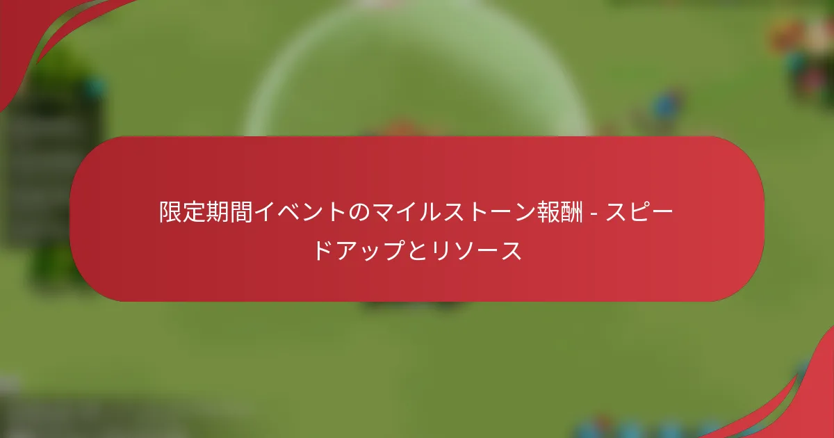 期間限定イベントのマイルストーン報酬は、プロモーションイベント中に特定のタスクを完了することでプレイヤーが貴重な報酬を獲得する機会を提供します。これらの報酬には、ゲームプレイを大幅に向上させ、より迅速な進行を促進するための重要なスピードアップやリソースが含まれています。利益を最大化するためには、参加ガイドラインを理解し、イベント期間中に進捗を積極的に追跡することが重要です。 期間限定イベントのマイルストーン報酬とは? 期間限定イベントのマイルストーン報酬は、プロモーションイベント中に特定の目標を達成したプレイヤーに与えられる報酬です。これらの報酬には、ゲームプレイや進行を大幅に向上させる貴重なスピードアップやリソースが含まれています。 マイルストーン報酬の定義と重要性 マイルストーン報酬は、限られた時間内にあらかじめ定められた目標を達成することでプレイヤーが得られる報酬です。これらの目標は、プレイヤーがタスクを完了したり、ゲームプレイ活動を通じてポイントを蓄積したりすることを必要とします。これらの報酬の重要性は、イベント中にプレイヤーがゲームにより深く関与するよう動機付ける能力にあります。 具体的な報酬を提供することで、マイルストーン報酬はプレイヤーがゲームに時間と労力を投資することを促し、全体的な体験を向上させます。これにより緊急感と興奮が生まれ、プレイヤーがイベントに積極的に参加する可能性が高まります。 スピードアップとリソースの種類 マイルストーン報酬には、ゲームプレイを助けるさまざまな種類のスピードアップやリソースが含まれています。スピードアップ報酬は、プレイヤーが建設、研究、訓練の時間を短縮できるようにし、ゲームの進行にとって重要です。 スピードアップ報酬: これには、短時間のブースト(1時間のスピードアップなど)から、数日間の長時間のものまでさまざまなものがあります。 リソース報酬: プレイヤーは、建物の建設やアップグレードに必要な木材、石、食料、金などのリソースを受け取ることがあります。 これらの報酬は、さまざまなプレイヤーのニーズに応えるように設計されており、イベントに参加することで誰もが利益を得られるようになっています。 マイルストーン報酬がゲームプレイを向上させる方法 マイルストーン報酬は、プレイヤーに必要なリソースやスピードアップを提供することで、待機時間を大幅に短縮し、効率を向上させます。これにより、プレイヤーはより迅速に進行し、目標を達成しやすくなります。 さらに、これらの報酬を獲得する競争的な側面は、プレイヤー間のコミュニティ意識を育むことができ、彼らは自分の成果や戦略を比較することができます。この相互作用は、より魅力的なゲーム体験につながります。 期間限定イベントの期間と頻度 期間限定イベントは、ゲームの設計やプロモーション戦略に応じて、通常数日から数週間続きます。これらのイベントは定期的にスケジュールされることが多く、プレイヤーはそれに備えて準備することができます。 プレイヤーは、マイルストーン報酬を獲得するチャンスを最大化するために、今後のイベントについて情報を得ておくべきです。定期的な参加は、報酬の安定した蓄積につながり、全体的なゲームプレイを向上させます。 参加資格基準 マイルストーン報酬イベントに参加するための資格は、通常、特定のレベルに達することや予備タスクを完了することなど、特定の基準を満たす必要があります。これにより、すべての参加者が報酬を競う公平なチャンスを持つことが保証されます。 レベル要件: プレイヤーは、イベントに参加する前に特定のレベルに達する必要がある場合があります。 アカウントの状態: 一部のイベントでは、プレイヤーが良好な状態のアクティブなアカウントを持っていることが求められる場合があります。 これらの基準を理解することは、期間限定イベントとその関連報酬を最大限に活用したいプレイヤーにとって重要です。 期間限定イベントのマイルストーン報酬に参加する方法 期間限定イベントのマイルストーン報酬に参加するには、スピードアップやリソースのような報酬を得るために特定のタスクを完了する必要があります。参加ガイドラインを理解し、進捗を追跡することが、イベント中の利益を最大化するために不可欠です。 イベントに参加する手順 期間限定イベントに参加するには、まずアカウントのレベルや特定のゲームの成果など、必要な前提条件を満たしていることを確認してください。資格がある場合は、ゲームインターフェースのイベントセクションに移動し、参加登録を行います。 登録後は、イベントのルールやタイムラインに慣れてください。各イベントには通常、開始日と終了日があり、マイルストーン達成に寄与するタスクのリストがあります。 報酬を向上させる特別なボーナスや期間限